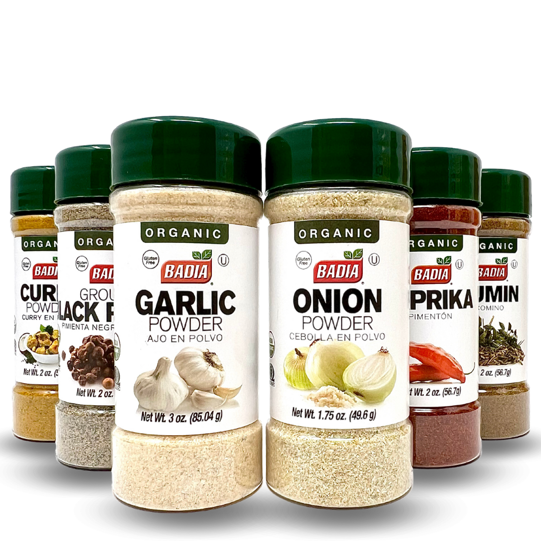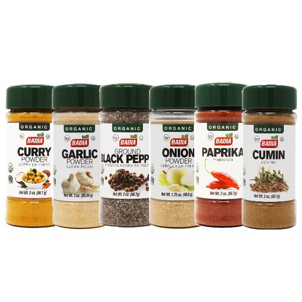 Introducing the Badia Organic Spices Basic Bundle - the perfect addition to your pantry! Our bundle includes 6 essential organic spices for all your cooking needs. The pack includes organic black ground pepper, organic paprika, organic cumin, organic garlic powder, organic onion powder, and organic curry powder. All of our spices are 100% certified organic, ensuring that you have the best quality spices to work with. The black ground pepper is perfect for adding a kick of flavor and heat to your dishes. The paprika is perfect for adding a smoky flavor and beautiful red color to your dishes. The cumin adds an earthy, nutty flavor to your dishes. The garlic powder and onion powder add a nice flavor and aroma to your dishes. Lastly, the curry powder adds a unique flavor with a combination of spices. This basic bundle is perfect for those who want to add some flavor and spice to their dishes without breaking the bank. With 6 essential spices, you'll have all the basics you need for your cooking adventures. Add the Badia Organic Spices Basic Bundle to your pantry today and get cooking!